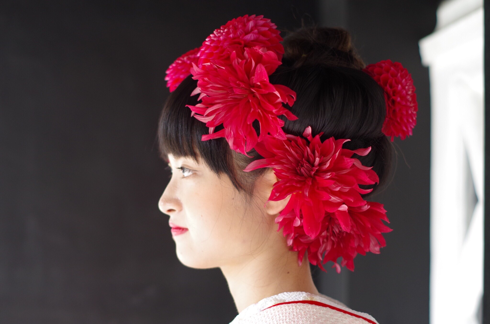 このお着物は武田嘉平衛商店さんにお借りしたお着物です。可愛くも、クールにも着こなせる色合いで、モデルさんにもとても似合っています(^^)