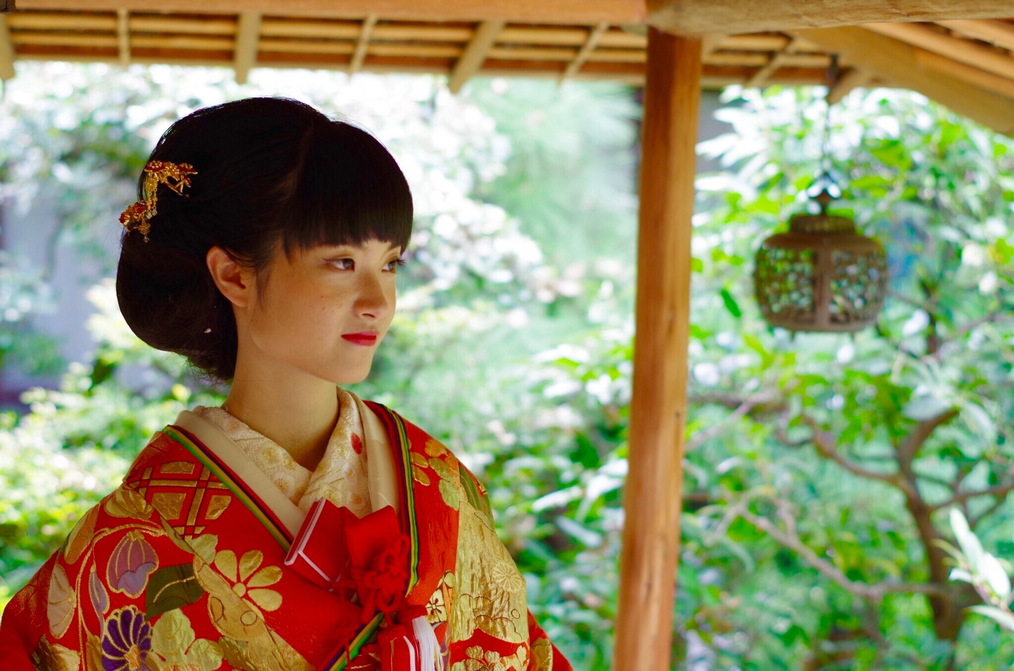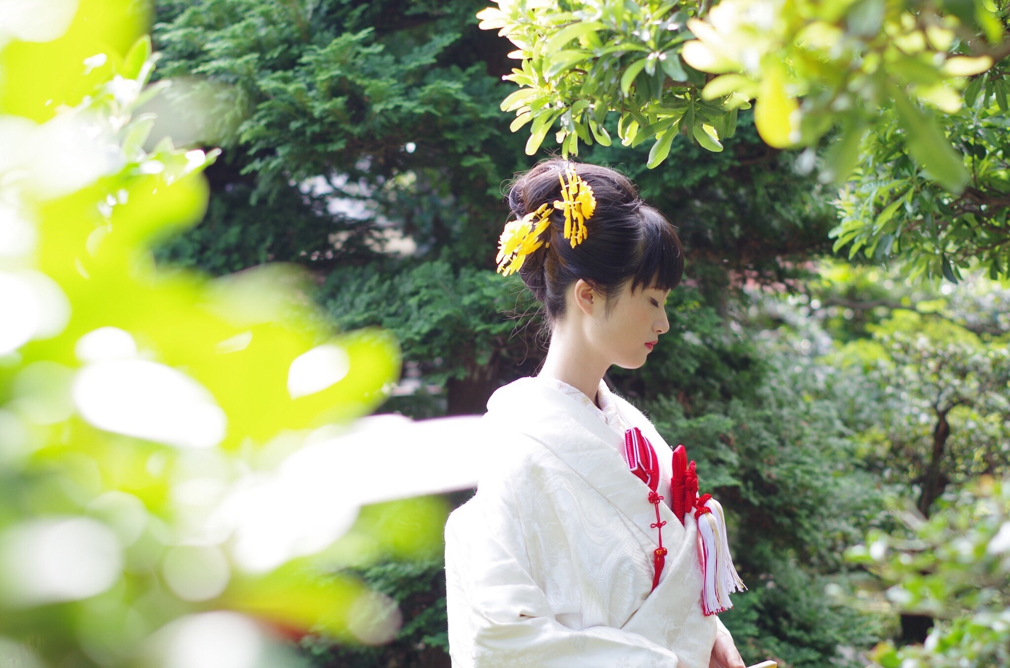小物の赤がお庭とマッチして花嫁様を引き立てます!